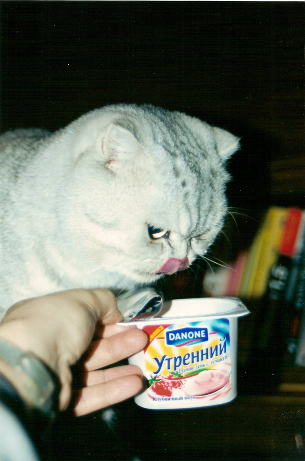 Оливки, йогурт, кофе и пиво - обычная еда этого необычного кота. Тимофей, кот нашего зятя Димы. 3 ноября 2002 г.