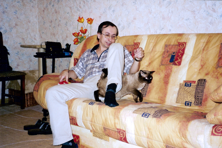 Юра (не Куклачев) дрессирует Филю. На съемной квартире на Проспекте Мира, октябрь 2001 г.