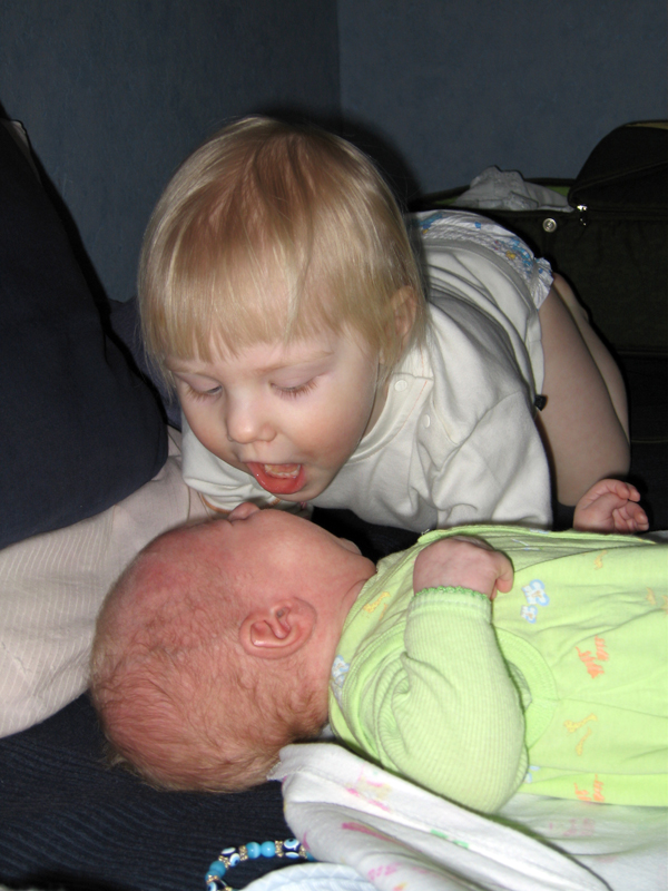 Двухлетняя Тася как может выражает любовь к брату своему меньшему. 2 апреля 2005 г.