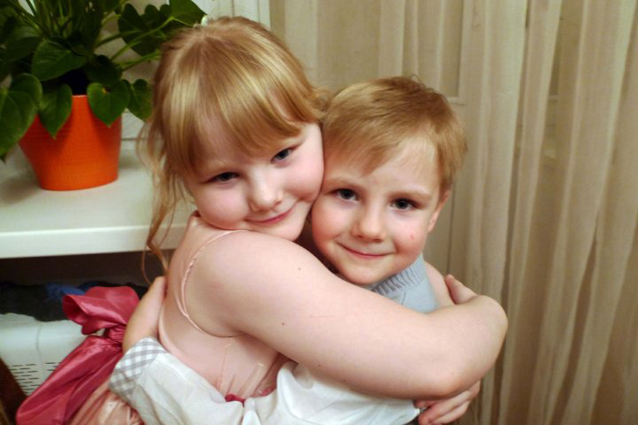 В перерывах между борьбой случаются периоды дружбы и даже любви. Мои старшие внучата Тасюша и Николочка. 1 ноября 2009 г.
