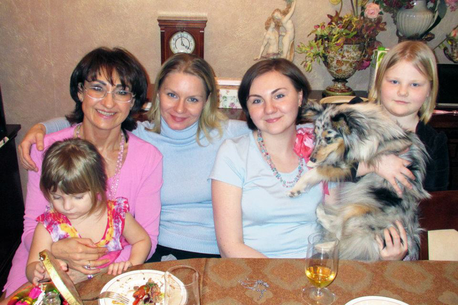 Девочки нашей семьи: Милена, я, Галя, Шура, Тася с собачкой Ярой. 14 февраля 2012 г.