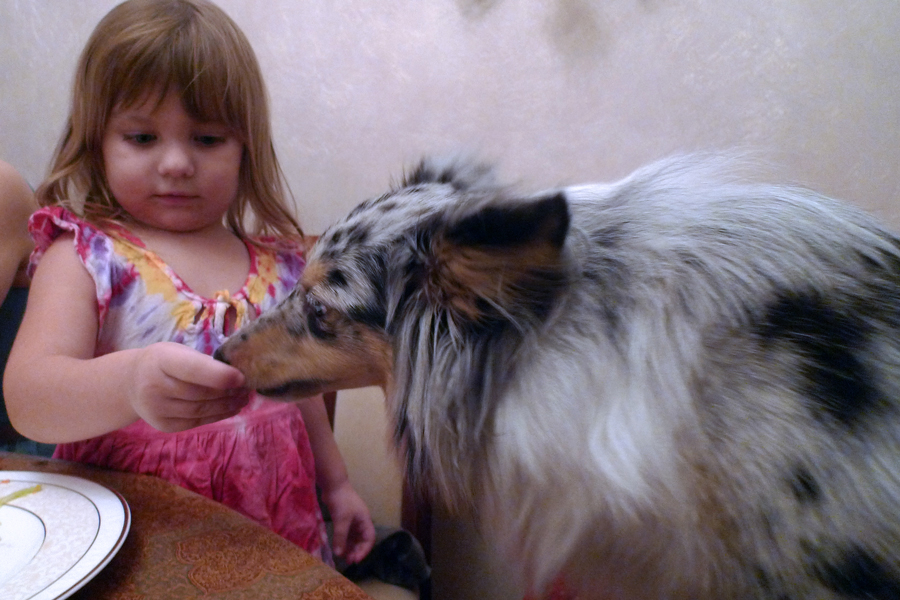 Пока родители и тетя не видят, Милена балует Яру вкусненьким с праздничного стола. 31 декабря 2011 г.