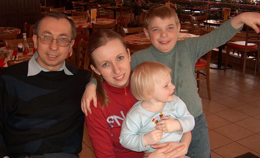 Юра со своими детьми Ниной и Сашей и нашей внучкой Тасей. Кафе "Фрайдис" в ТЦ "Атриум. 8 марта 2005 г.