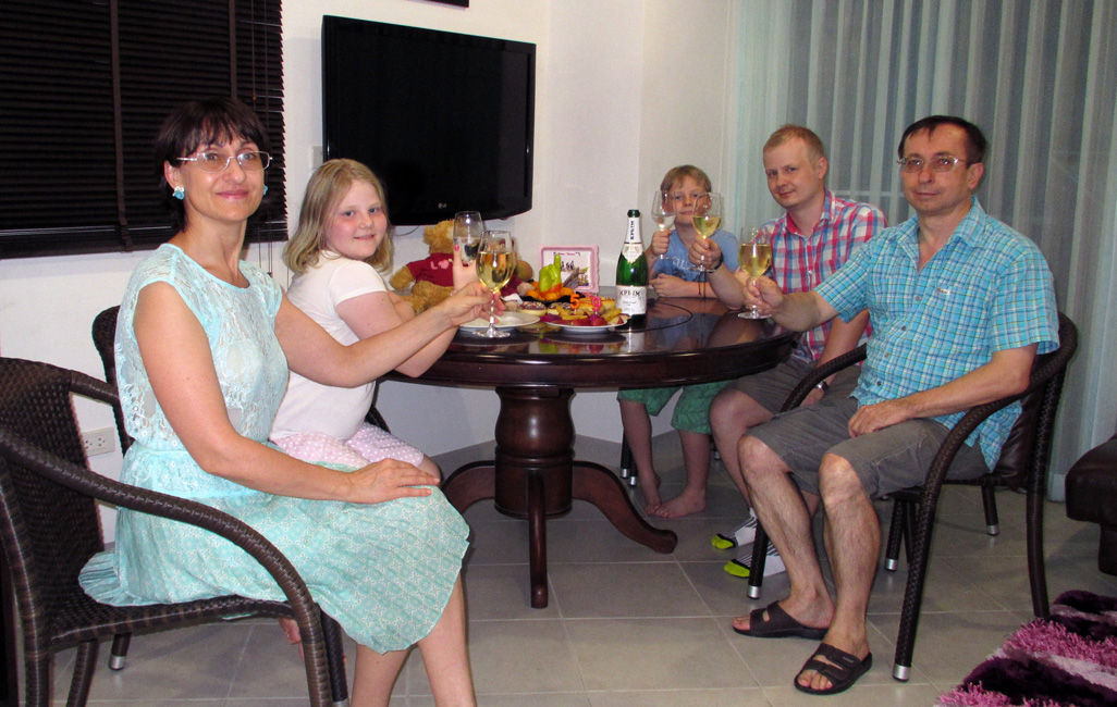 Мы с Димой, Тасей и Колей подзравляем Юру с днем рождения. Паттайя, час ночи, 16 ноября 2013 г.