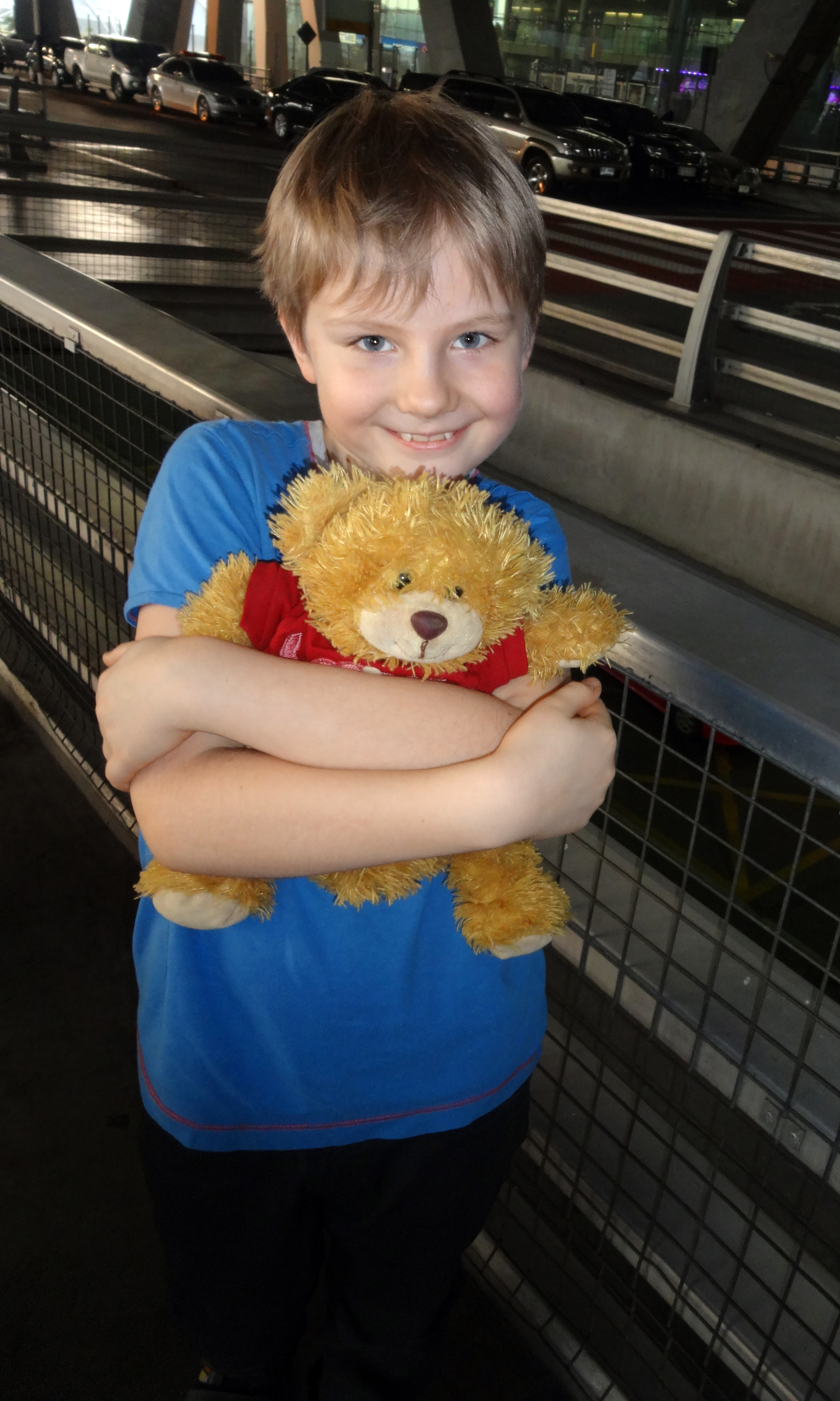 Коля со своим неизменным мишкой в аэропорту Бангкока. 23 марта 2014 г.