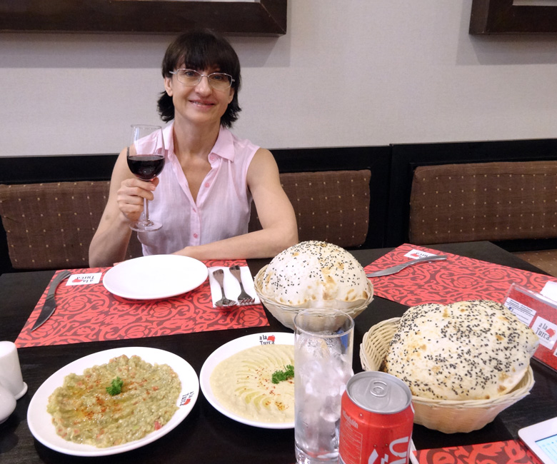 В ресторане "A la Turca" в Паттайе с фантастическими шарообразными лавашами, хумусом и баклажанным пюре. 6 января 2014 г.